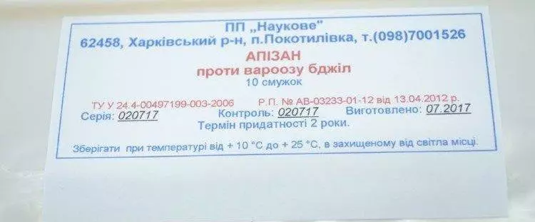 СКЛАД: Одна смужка містить: 40+0,001мг натрію. За механізмом дії Апізан є вираженим акарицидом, який згубно діє на периферичну та центральну нервову систему кліща Varroa Jakobsoni. Флювалінат, діюча речовина препарату, гальмує проникність в аксонових мембранах нейронів, внаслідок чого порушується передача нервових імпульсів, що спричиняє перезбудження та смерть паразита через нервове виснаження. Ефективність препарату – понад 95%. Залишки препарату не накопичуються в меді та перзі. Для бджолиних сімей, які утримуються в 20-24 рамкових вуликах - 4 смужки, а 10-12 рамкових - 3 смужки, в багатокорпусних вуликах. - По 2 смужки на кожен корпус. Для слабких бджолосімей, відводків, які мають менший простір вуликів, застосовують половину смужок. Смужки апізану вводять у міжрамковий простір у вулику в центральну зону бджолиного гнізда (де найбільша кількість розплоду та молодої бджоли). Для цього вулики трохи розширюють так, щоб смужки не торкалися сот і бджоли могли рухатися з обох боків смужки. Смужки фіксують у підвішеному стані поперечною шпилькою. При проведенні діагностичних обробок для визначення ступеня ураження сімей вароатоз перед кріпленням смужок на дно вулика кладуть папір або поліетилен змочений маслом або вазеліном. Смужки повинні знаходитися в гнізді не менше 7 діб. За цей період вкладиші перевіряють на наявність загиблих кліщів кожні 2 дні.